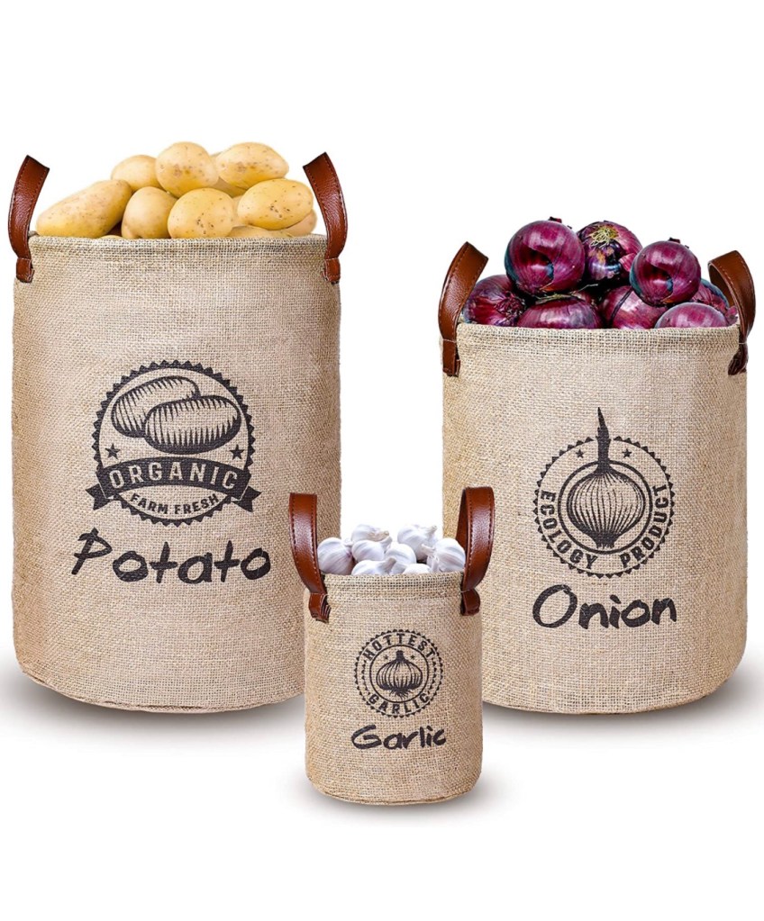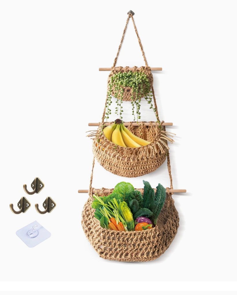Boho design https://amzn.to/3CrFvoX Modern Boho Decor: This wall hanging fruit basket is the perfect boho addition to your kitchen. It will nicely display your fruit, veggie, produce or anything else you store in this macrame hanging basket. Crafted with Love: Designed by a fellow boho lover, this fruit wall basket is an eye catcher for sure! The intricate knotting pattern combined with the wooden dowel and hanging tassels make this macrame fruit hanger a very special piece. Handmade with Highest Quality Standards.Showcase our fruits with this https://amzn.to/3jGJqaU .Space Saving: This black fruit stand is of perfect size, holds a lot of produce, used to store and organize not only fruits and vegetables but also other things. This decoratively arranged tiered basket is perfect for showcasing fresh, colorful fruits and vegetables in the kitchen, stores. Three Sizes of Baskets: Overall height 23 inch. The diameter of every basket that from top to bottom is 8” diameter * 3” height, 10” diameter * 3.5” height, 12” diameter * 4” height. It will enhance your kitchen decor, organization or storage.This https://amzn.to/3GEWab3 MULTI-FUNCTIONAL HANGING BASKET: These hanging baskets provide good storage for kitchen, bathroom, living room etc. Whether using them as woven baskets for storage, vegetable basket, hanging fruit basket, egg basket, or produce basket they’ll add a natural touch to your home decor! NATURAL TWINE: Sturdy and durable. These handwoven storage baskets are made from eco-friendly natural twine without any chemical additives by masterful skilled vietnamese artisans. They are crafted sturdy yet soft, with a tight weave so should last a good long time.This hanging https://amzn.to/3i7sEBC .Hand Woven Jute Hanging Baskets: Jute is a natural fiber, strong and serviceable.You will receive 3 fruit baskets for wall storage, carefully handcrafted and woven from high quality jute rope. This saves space in your home and makes your life more organized. Large Capacity: The whole woven hanging woven wall basket is 14.2 inches wide and 33 inches high. The storage space is so large that it can be hung in the kitchen to store items such as potatoes and fruit. The sturdy construction is enough for your daily use.How about this https://amzn.to/3vH2A3j Jute material: products made of jute can have a characteristic smell, especially at first; Over time, it erodes completely; Jute is a natural fiber strong, serviceable, color and light-fast fiber; The white option is hand-woven with cotton thread material and has no smell Hand Woven Jute Hanging Baskets: you will receive 3 pieces of fruit baskets for wall storage, which are carefully hand made and woven from quality jute rope, you will also acquire 3 pieces of hooks for hanging.our wall mounted bags will help with your kitchen space and can also be applied as wall baskets for flowers or plants, which can save your home space and make your space more organised.Check this https://amzn.to/3Ghohfh : Onion, Garlic And Potato Canister Set – Potato Bin Garlic Keeper Onion Storage. Ever buy bags of potatoes, onions and garlic and don’t know where to put them because they’re so messy? .These canisters will hold these ingredients with no hassle! Buy what you need and just stick them in the canisters for easy, fast access. No need to get onion skins all over your pantry or garlic cloves all over your counter, instead keep them fresh in these canisters.Reusable vegetable bags https://amzn.to/3jTtH8s keep root vegetables fresher for longer. Keeps potatoes, onions, and garlic dry to prevent premature sprouting. Jute bags are durable and can be used for a long time. Dimensions Potato container height is 14.6 inches; opening diameter is 10 inches. Onion container height is 11.8 inches; opening diameter is 9 inches. Garlic container height is 7 inches; opening diameter is 5 inches. Package includes: 1 x potato storage bag 1 x onion storage bag 1 x garlic storage bagThis https://amzn.to/3vBJZ8I 4 Packs Stackable Baskets : The basket is made from premium thick diameter metal wire with top-notch powder coating finish, which are sturdy, anti-rust and anti-corrosion. With DIY Label Cards: You can make your DIY label cards (1 white label card for each basket). It can help you easily find what you need from various goods. Perfect Pantry Baskets: This storage basket can be stacked to save space, store and organize various foods. Rotate the handles to stack and they can bear up to 5kg. Wide Use Kitchen Storage: These metal wire baskets are great for closets, refridge, bedrooms, bathrooms.Check this https://amzn.to/3Zn2onw Potatoes, onions, and garlic are all great, versatile vegetables together but spoil under most situations, especially when near each other. These vegetable bins can keep all three close together for convenience while also extending their table life by keeping them dark yet ventilated and separated from each other. Keep your onions and potatoes from sprouting so you can cook them with peace of mind. Tough metal tin keeps whatever’s inside safe from accidental bumps and jumps. Specially cut out holes keep the bins ventilated so your vegetables don’t stagnate in their own air. And with the holes cut at a low angle, light won’t pour in to sustain a wayward sprout from appearing on your potatoes or onions to ruin them.