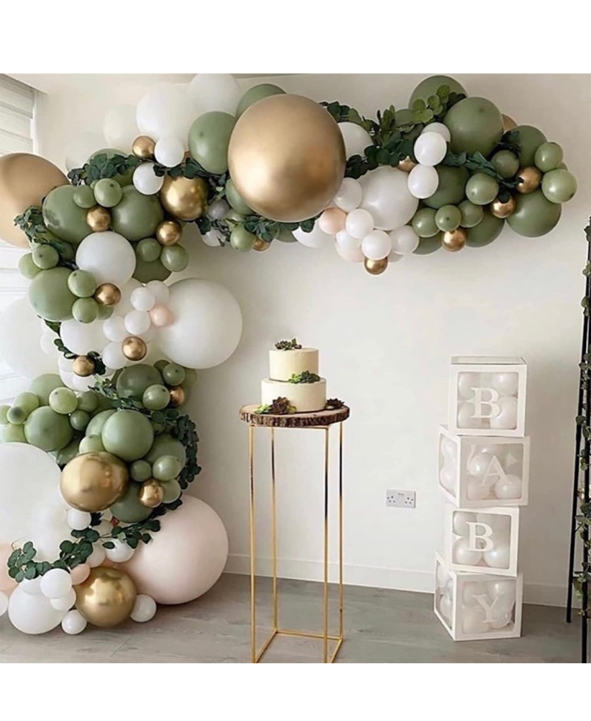 Package including: 152Pcs/set(2pcs white 18inch balloons,1pcs 18inch skin balloon,2pcs 18inch metal gold balloons,5pcs 12inch metal gold balloons,12pcs 10inch white balloons,2pcs 10inch skin balloons,30pcs 10inch green balloons,36pcs 5inch white balloons,5pcs 5inch skin balloons,40pcs 5inch green balloons,15pcs 5inch metal gold balloons,1 roll of 16 feet arch balloon strip tape,1 roll of 100 points stickers.)