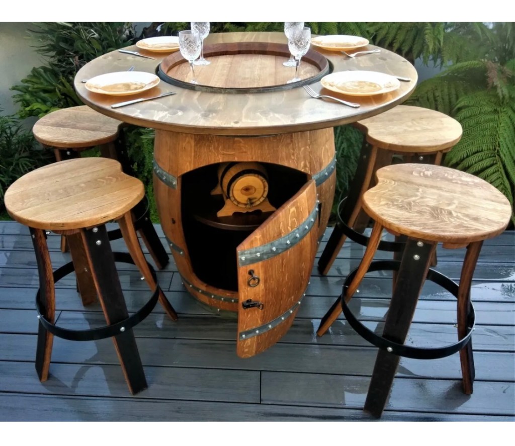 These aesthetic looking table top and stand table bars made from repurposed winebarrels are sure to provide a beautifulcentre-piece.
