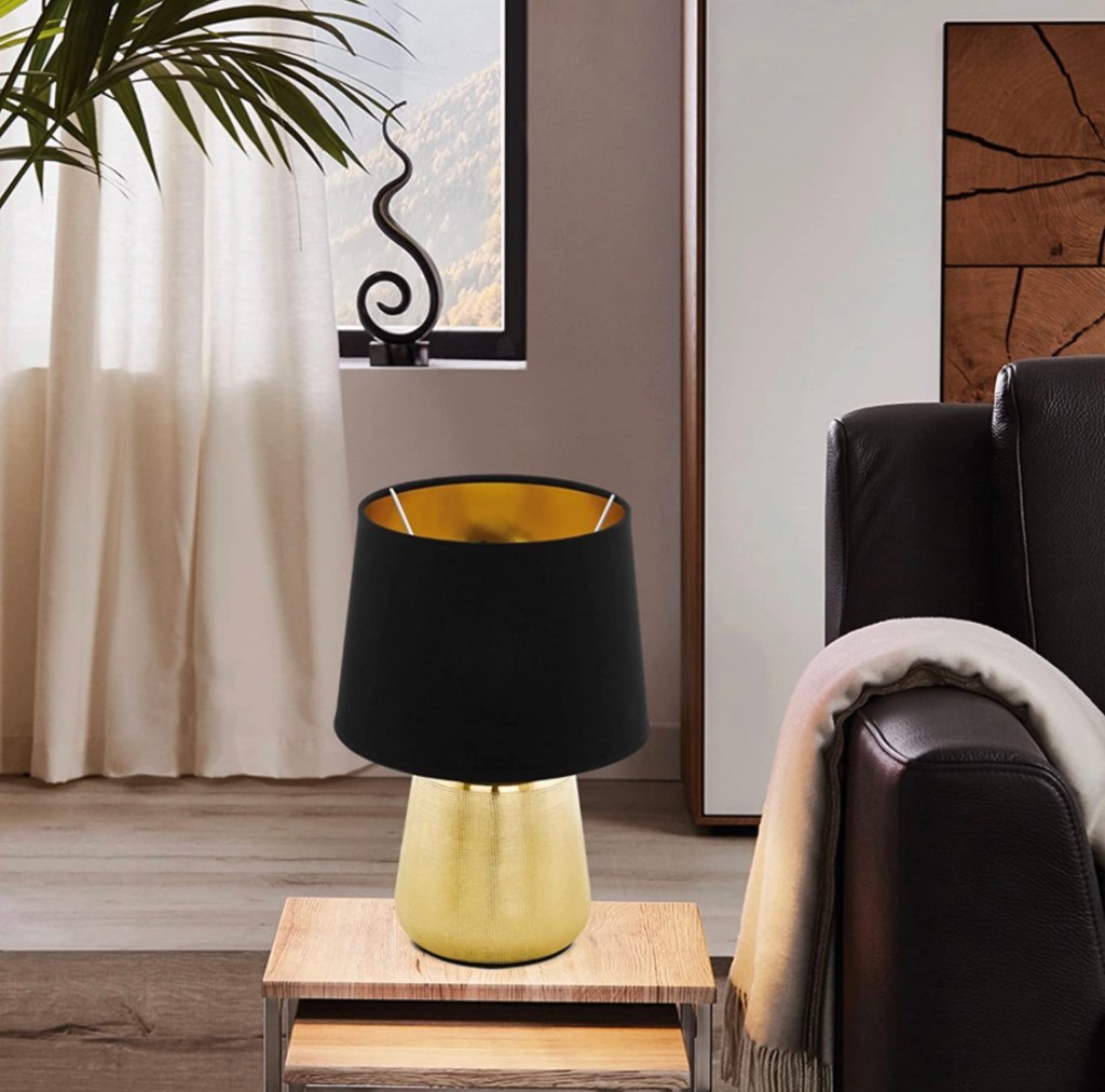 The decorative bedside lamp with a gold ceramic base and a round black textile lampshade with gold interior blends seamlessly into modern interiors.