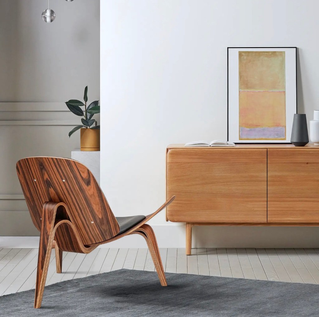 The elegant and interesting Shell Chair, originally created by Hans Wegner, uses a triangular footprint and bold arched seat to create a chair of unusual proportions, yet it’s this unusual design that makes the smiling chair the classic that it is.