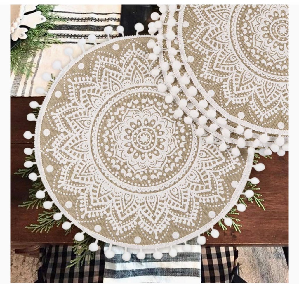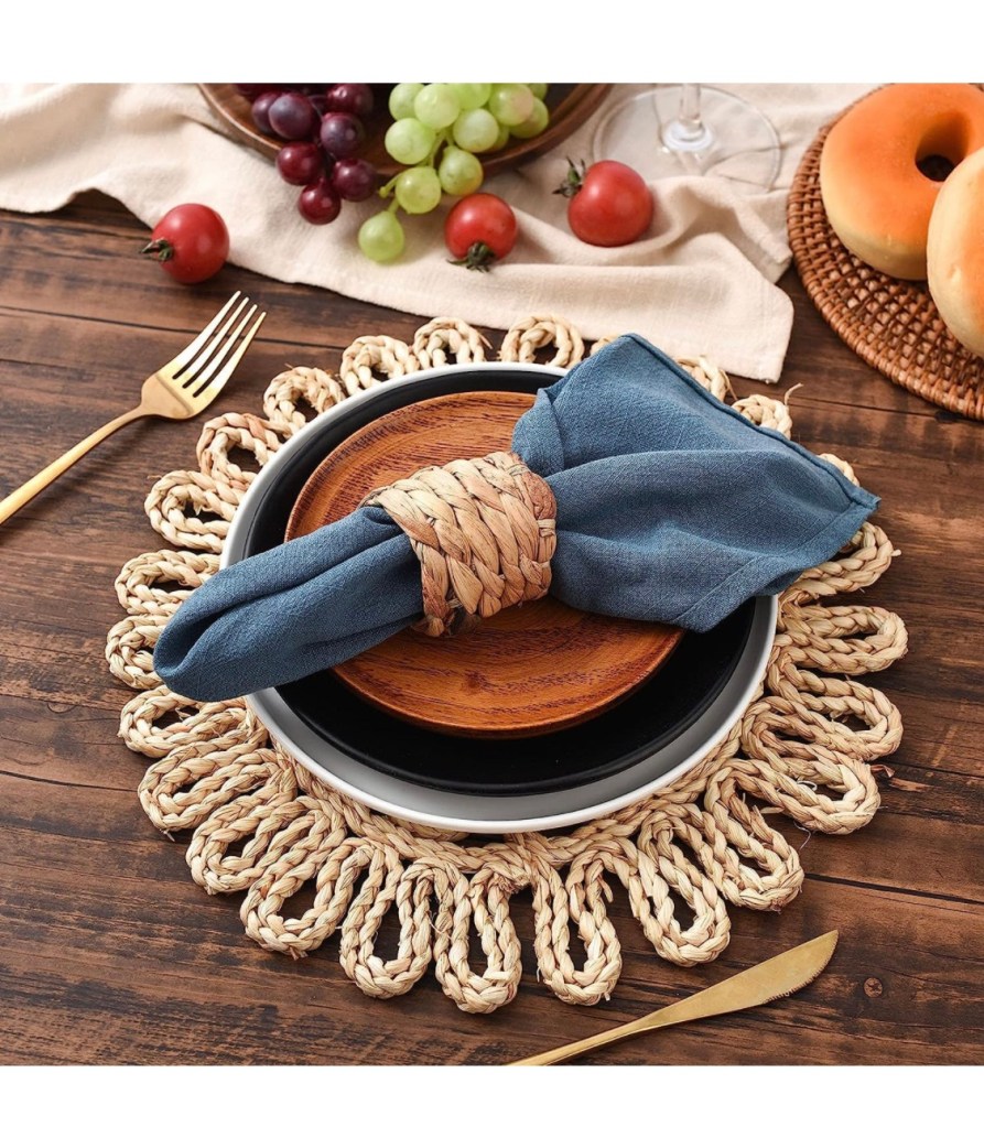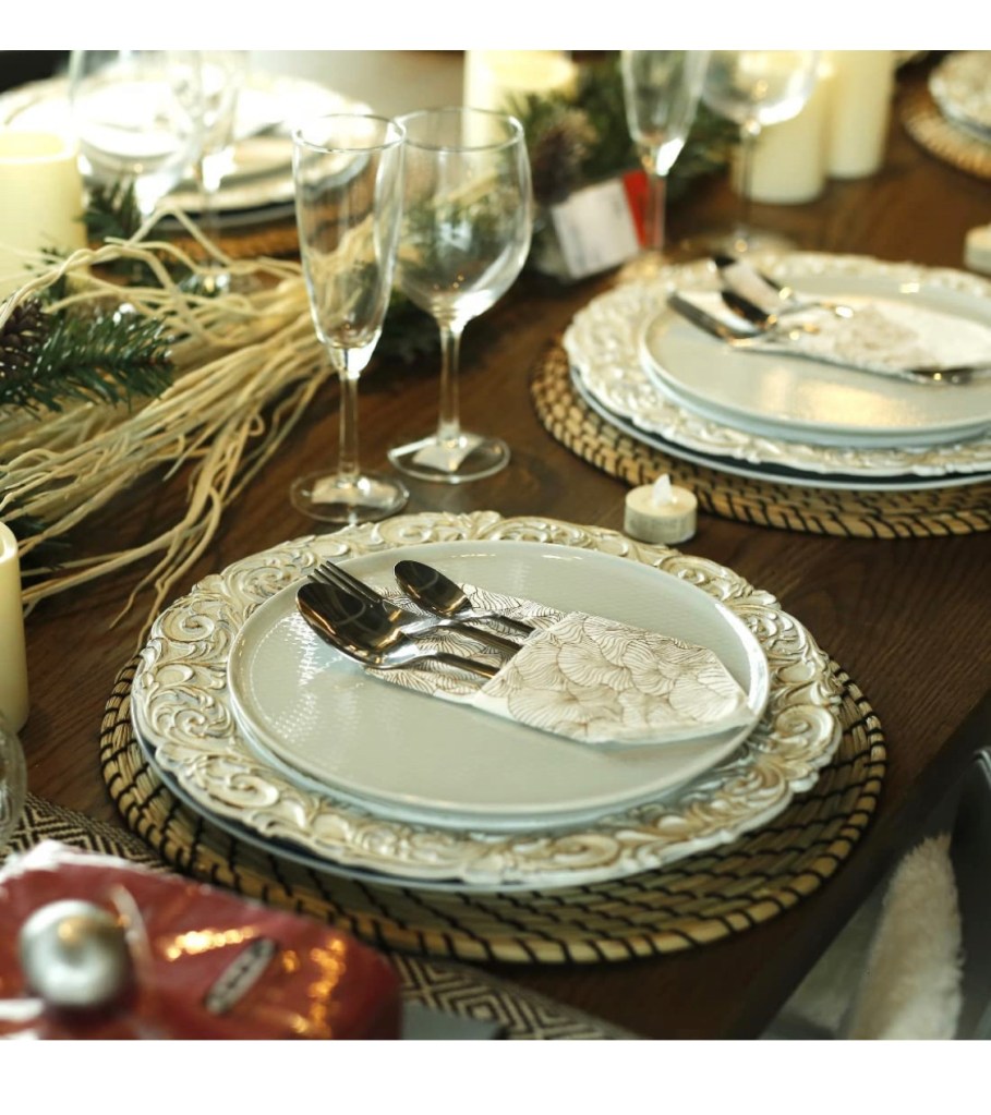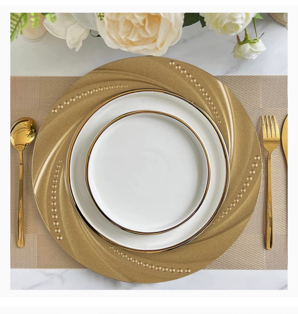 MAONAME Round 13 Inch Plastic Charger Plates, https://amzn.to/3EbXC2D Golden Service Plate for Kitchen, Dining, Wedding, Elegant Decoration (6, Gold)Rickion Charger Plates and Napkin Rings, Set of 6, Silver Chargers for Dinner Plates https://amzn.to/40NjACY – Unique, Elegant, Bubble Plate Chargers & Matching Napkin Rings – Thick, Reusable PP PlasticPinkunn 24 Pcs Clear Charger Plates Bulk 13 Inch Clear with Gold Border Plastic Dinner Chargers https://amzn.to/3Pd3D5D Round Plastic Charger Plate Decoration Plates l for Party Banquet Wedding Family Dinner Table DecorationMAONAME 14″ Antique Gold Charger Plates with Embossed Rim, Plastic Large Plate Chargershttps://amzn.to/47LGwGu for Dinner Plates, Set of 6, Holiday Table SettingUmisriro Antique Charger Plates,13 Inch White Dinner Plate Chargers Round Server Ware.Set of 6 https://amzn.to/3YTBkfu Plastic Embossed Charger for Dinner, Party, Wedding, Elegant Tableware Decoration. (White) (JJPF001W)Collive Boho Round Placemat 15 Inch – Farmhouse Woven Jute Fringe Table Mats Set of 4 with Pompom Tassel https://amzn.to/45n17iX Place Mat for Dining Room Kitchen Table Decor, White Mandala FlowerFunWheat Round Braided Placemats Set of 6 Place mats for Dining Tables Woven Heat Resistanthttps://amzn.to/3OLJ8vk Table Mats 15 inch Round Beaded Placemats White 13″ Round,Placemats for Dining Table,Beaded Placemats, https://amzn.to/3OJOdEs Beaded Charger Placemats,Holiday & Christmas Beaded Placemats,Beaded Glitz Charger SilverFunWheat Round Braided Placemats Set of 6 Place matshttps://amzn.to/3KWV1h4 for Dining Tables Woven Heat Resistant Cute Table Mats 15 inch(M Pom Pom Coffee)IcosaMro Round Woven Placemats for Dining Table Set of 6 set of 6: https://amzn.to/45qW40J round wicker placemats, 28-30cm in diameter (11 Inch), add nature’s breath to your dining tables