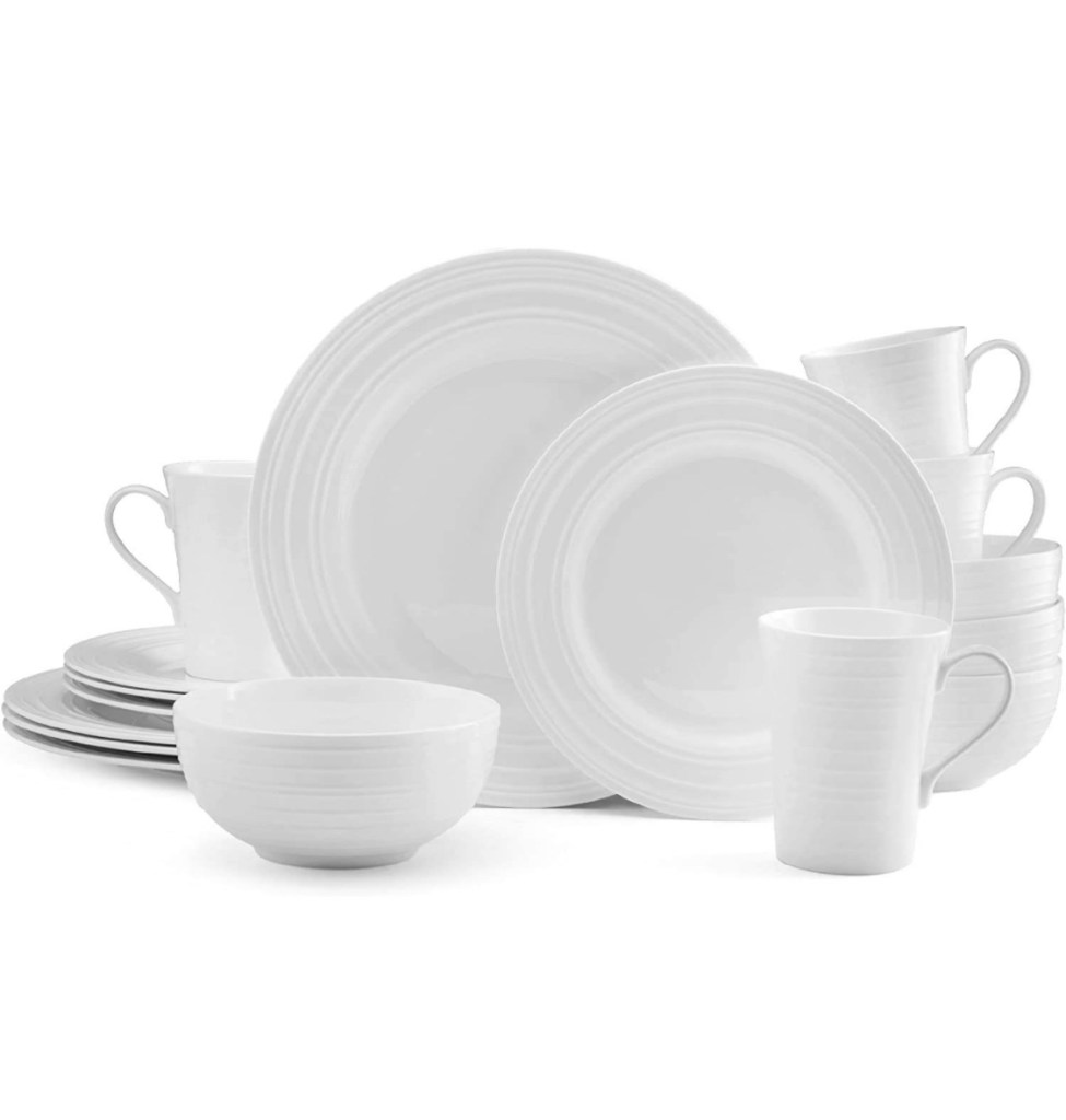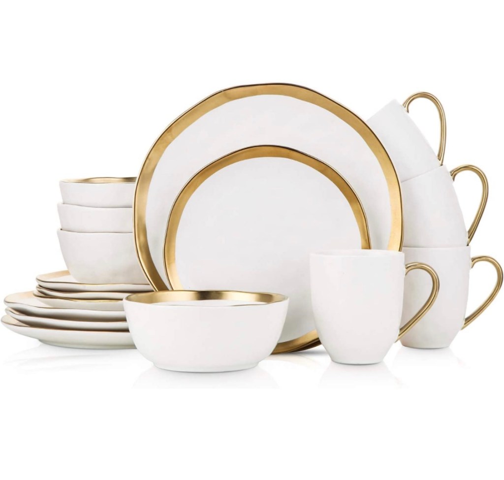 Service for four is perfect for everyday use; can be dressed up or down for all occasions. This bone china dinnerware set it oven, dishwasher, microwave and freezer safe and also chip-resistant.Stone Lain Porcelain 16 Piece Dinnerware Set, Service for 4,https://amzn.to/44ryUpU White and Golden Rim