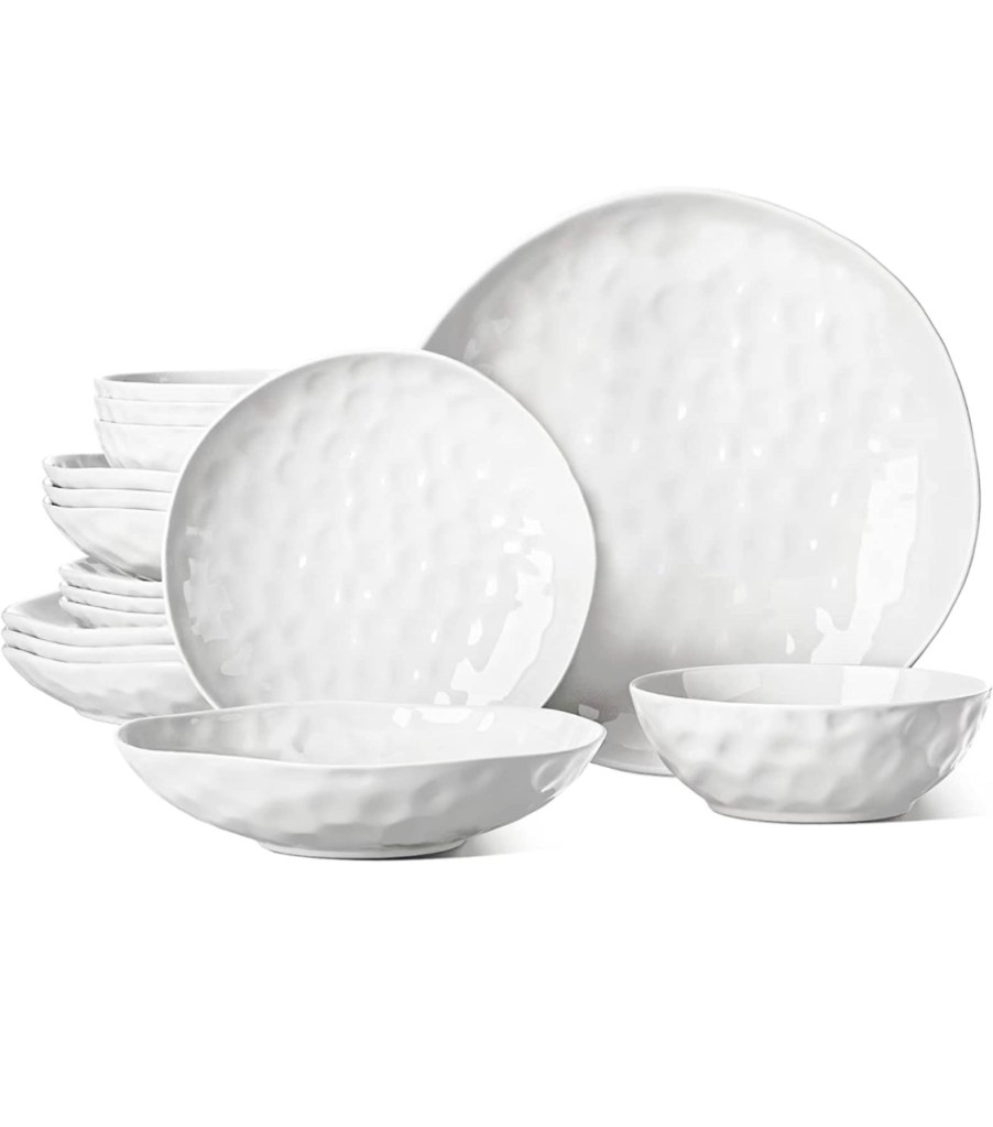 Farmhouse Style: HVH farmhouse style big dinner plates are unique and beautiful, which make your dinner attractive. The classic farmhouse design is suitable for any dining table settings and various occasions. Gibson Elite Embossed Bone China Double Bowl Dinnerware Set, Service for 4 (16pcs),https://amzn.to/3L0B7l7 White