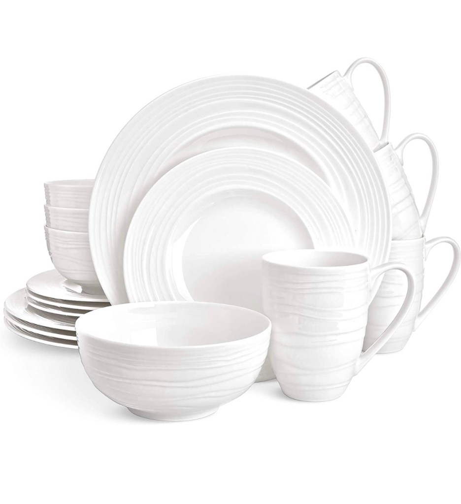 Round Plates, Bowls, Mugs – This elegant 16 piece dish set comes with 10” dinner plates, 7.5” salad plates, 4.5” bowls and 12 oz. mugs.