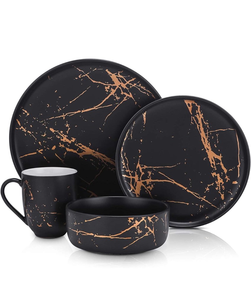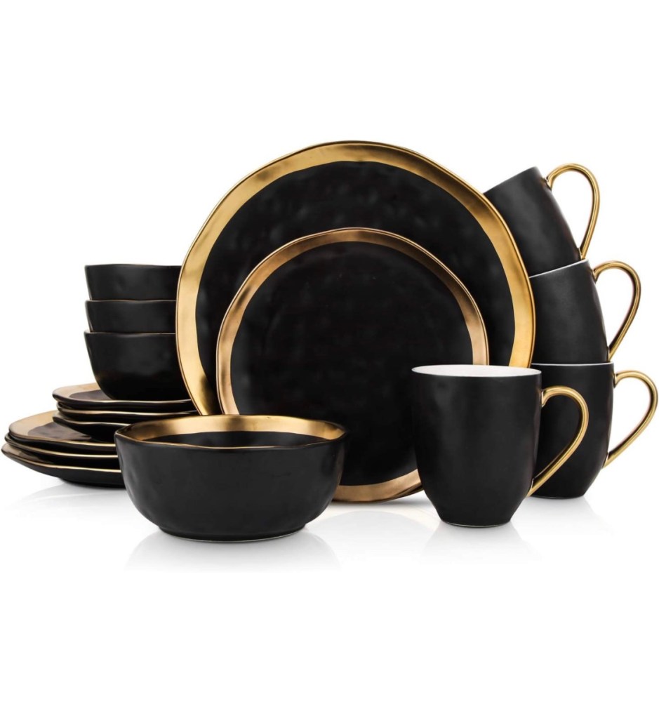 Stone Lain Modern Gold Splash Exquisite Fine China Dinnerware Set, 16 Piece – Service for 4, https://amzn.to/47Qa71x Black & Gold