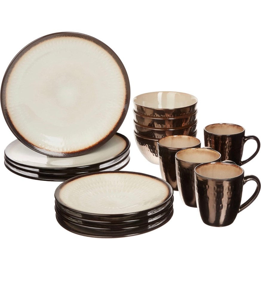 The perfect canvas for presenting a culinary masterpiece for spectacular dinners or just everyday dining. The beautiful colors with the dramatic black tutored effect create a beautiful tables cape for any occasion.Gourmet Basics Alexandria Dinnerware Sethttps://amzn.to/45vV8In (16 Piece),Tan