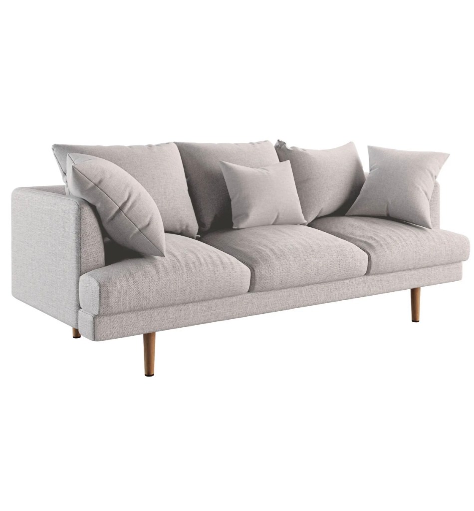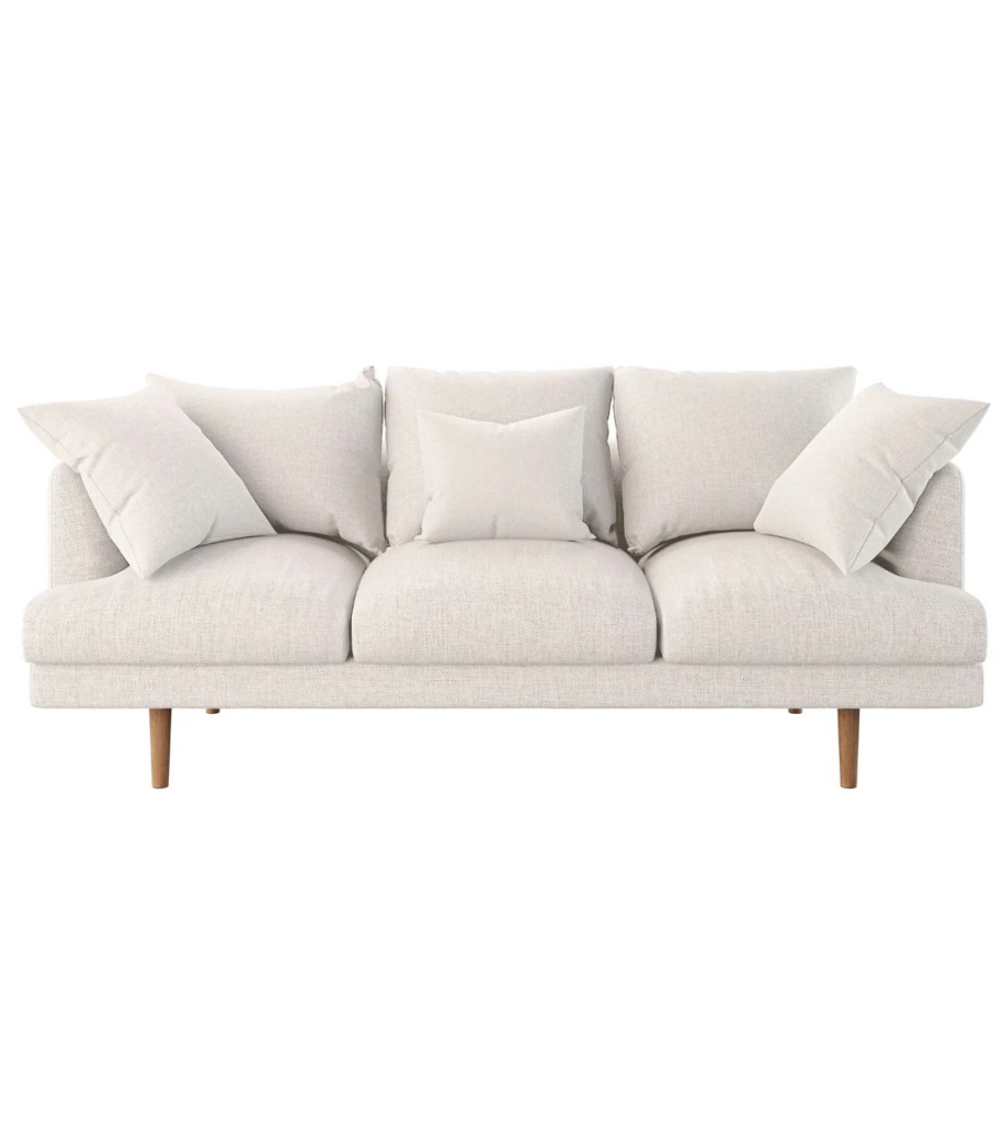 The frame of this sofa is made of solid wood and engineered wood to keep this sofa sturdy lasting many years. It has generously padded cushions with high-density foam and three throw pillows for extra comfort. The seat is supported with spring system suspension and its legs are solid wood, making this sofa ready for everyday wear and tear.