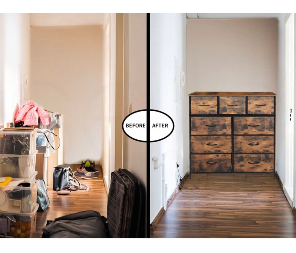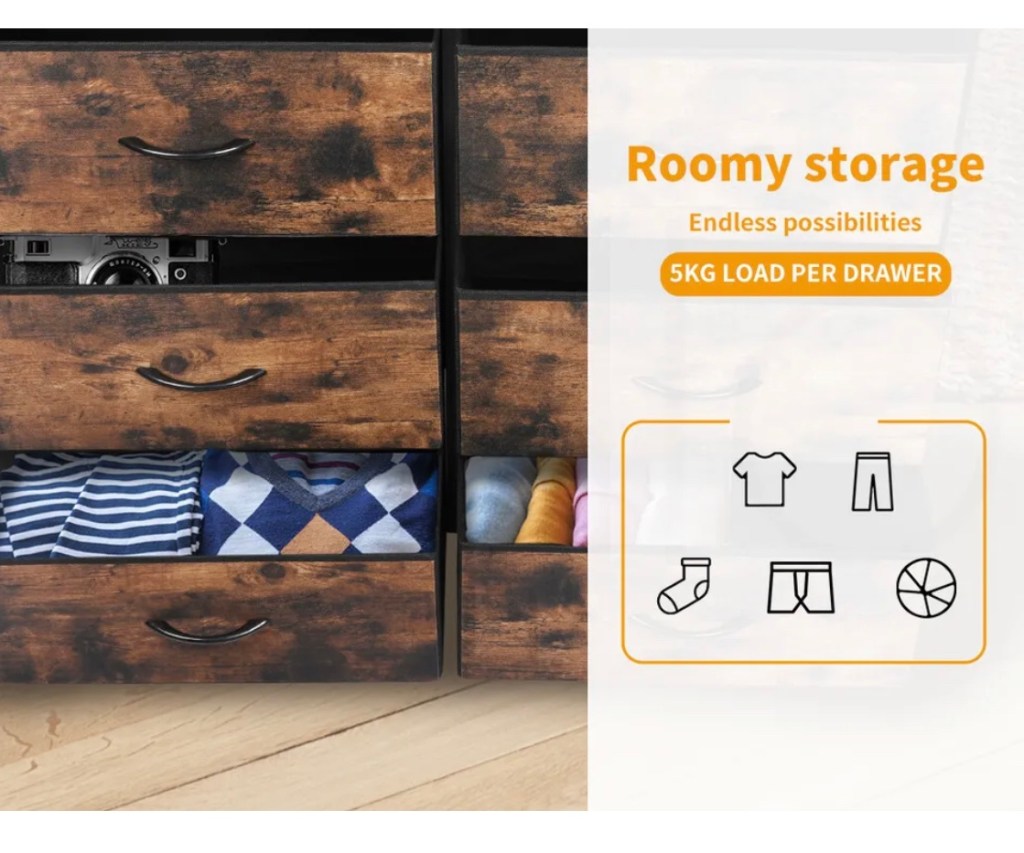 Will your chest of drawers fit? Measure you space first. Fill up the five drawers. Keep your bedroom neat and ordered. Now all your clothes have a home to live in. Or just store your clothes in piles on the floor.