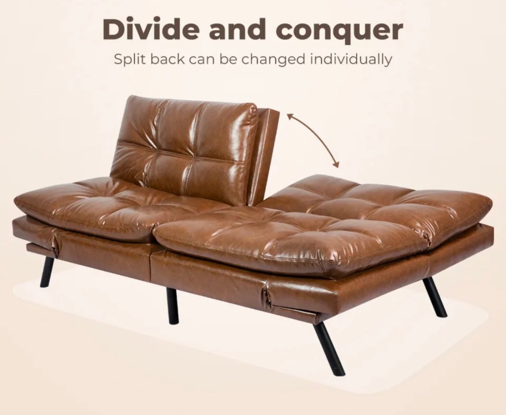 Fold your left seat or fold your right seat on your futon couch seat. Fold the left or the right arm down. Pick from several different angles. Sit upright for a movie. Recline a bit for a gaming session. All the way down for sleeping.