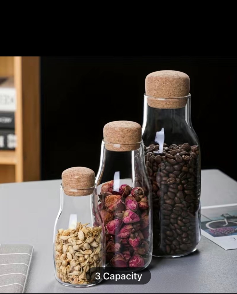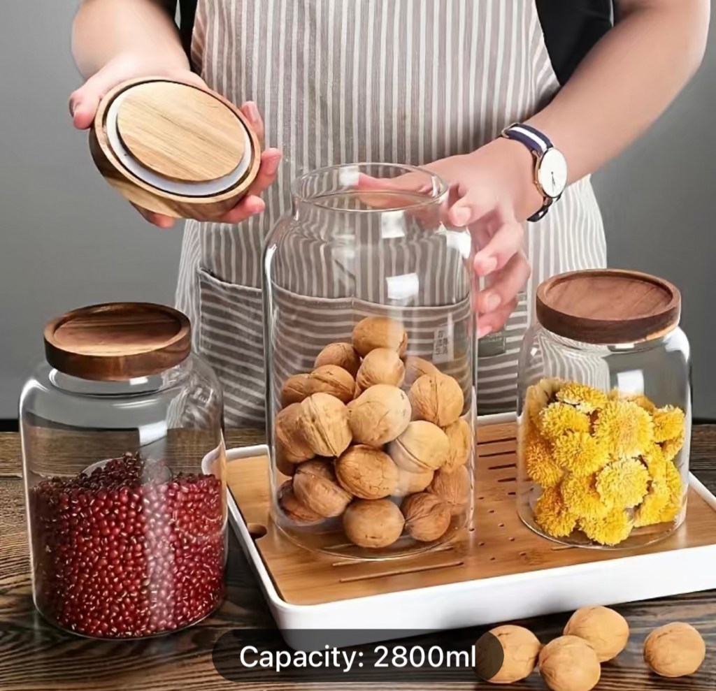 Glass storage containers with airtight wooden, bamboo, cork lids